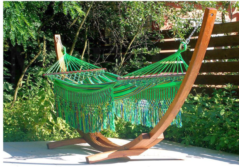 На загородном участке можно забыть о граммах. Классический гамак для дачи часто делают из плотного хлопка или плетут в технике макраме — это красиво и тактильно приятно. Некоторые мастера изготавливают такие модели своими руками, подбирая размер и рисунок под конкретный участок. Однако натуральные ткани долго сохнут, поэтому их лучше убирать под навес во время ливней. Если на участке нет подходящих опор, ситуацию спасет каркас. Каркасные конструкции, имеющие собственную стойку, становятся мобильной станцией релакса: сегодня вы отдыхаете у бассейна, завтра — разместить гамак можно в тени яблони.