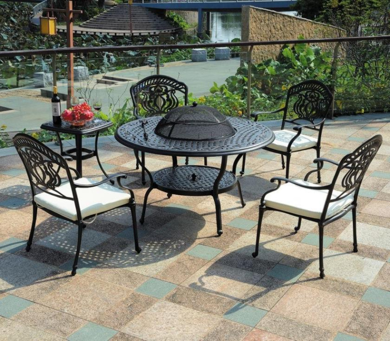 Обычная домашняя или дешевая пластиковая мебель для мангальной зоны не подходит: пластик оплавляется от жара и искр, необработанное дерево впитывает запах дыма и разбухает от осадков, текстильная обивка прогорает. Выбирайте материалы, рассчитанные на агрессивные условия эксплуатации рядом с открытым огнем.