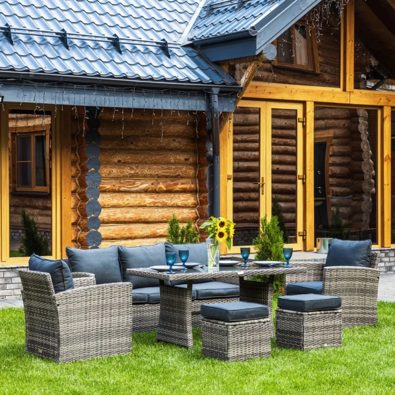 - Компактность и функциональность: Оптимальные размеры для небольших террас и просторных садов. Стол можно использовать отдельно.