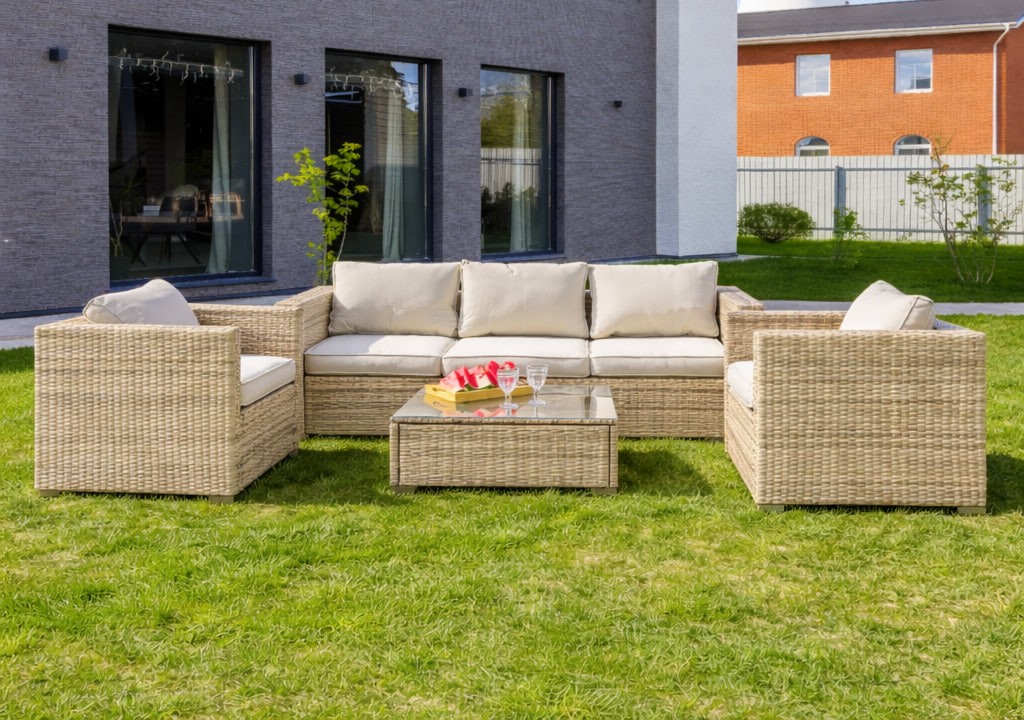 Просторный обеденный комплект из искусственного ротанга с мягкими подушками. Стильный и практичный для вечеринок и семейных обедов.