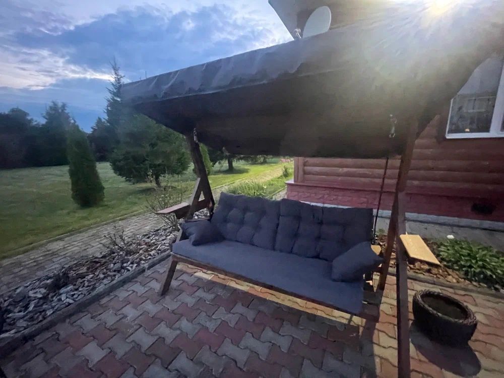 Рядом с деревянным домом качели Lyon из массива сосны создают уютную зону отдыха. Естественная текстура древесины и мягкие серые подушки гармонируют с фасадом, образуя целостный образ загородного бытия.