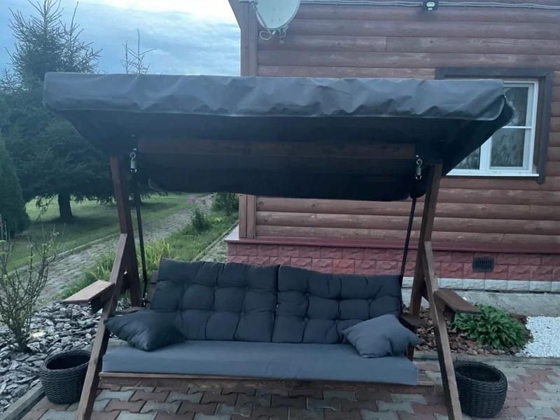 Качели Lyon из массива сосны с серыми подушками: природная гармония во дворе