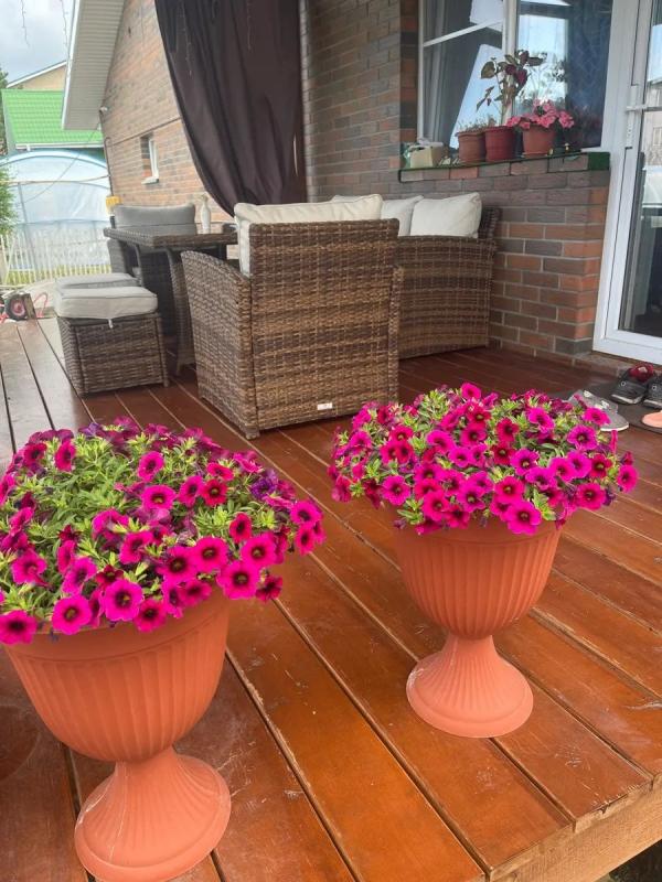 На загородной террасе лаунж-зона Royal Family ZOYA в коричневом цвете создаёт универсальное пространство для отдыха. Большой диван, два кресла с наклонными спинками и практичные пуфы позволяют каждому найти удобное место, а стеклянный стол объединяет зону для трапез и неспешных бесед.
