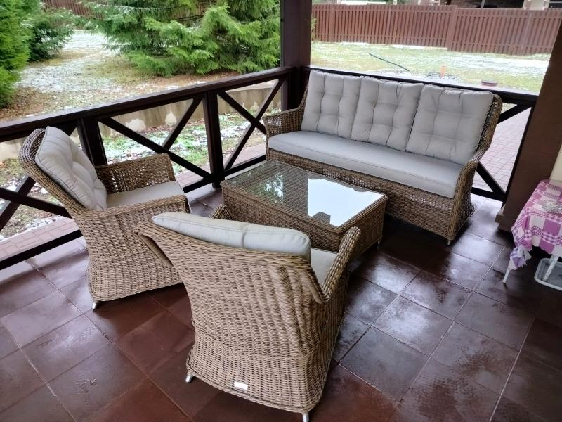 В комплекте всё необходимое для полноценного отдыха: просторный трёхместный диван, два глубоких кресла с высокими спинками и низкий журнальный стол со стеклянной столешницей. Лёгкий алюминиевый каркас оплетён первичным искусственным ротангом ручного плетения, что обеспечивает надёжность конструкции без лишнего веса. Светло-серые подушки с наполнителем из синтетического пуха и пенополиуретана идеально поддерживают спину и сохраняют форму при активном использовании.