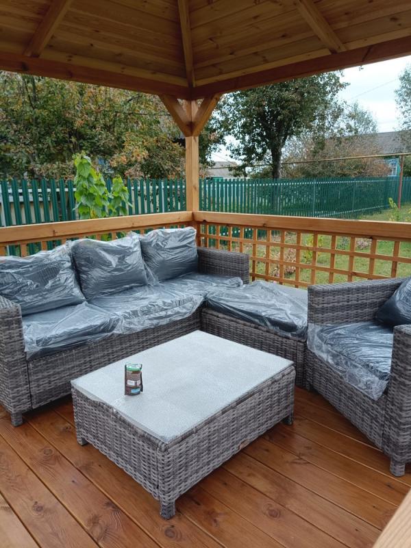 В просторной деревянной беседке на дачном участке комплект GRAND VICKY в сером цвете чувствует себя особенно органично. Трехместный диван, кресло, пуф и журнальный столик со стеклянной столешницей не загромождают пространство, а лишь подчеркивают его масштаб, создавая уютный островок для отдыха.