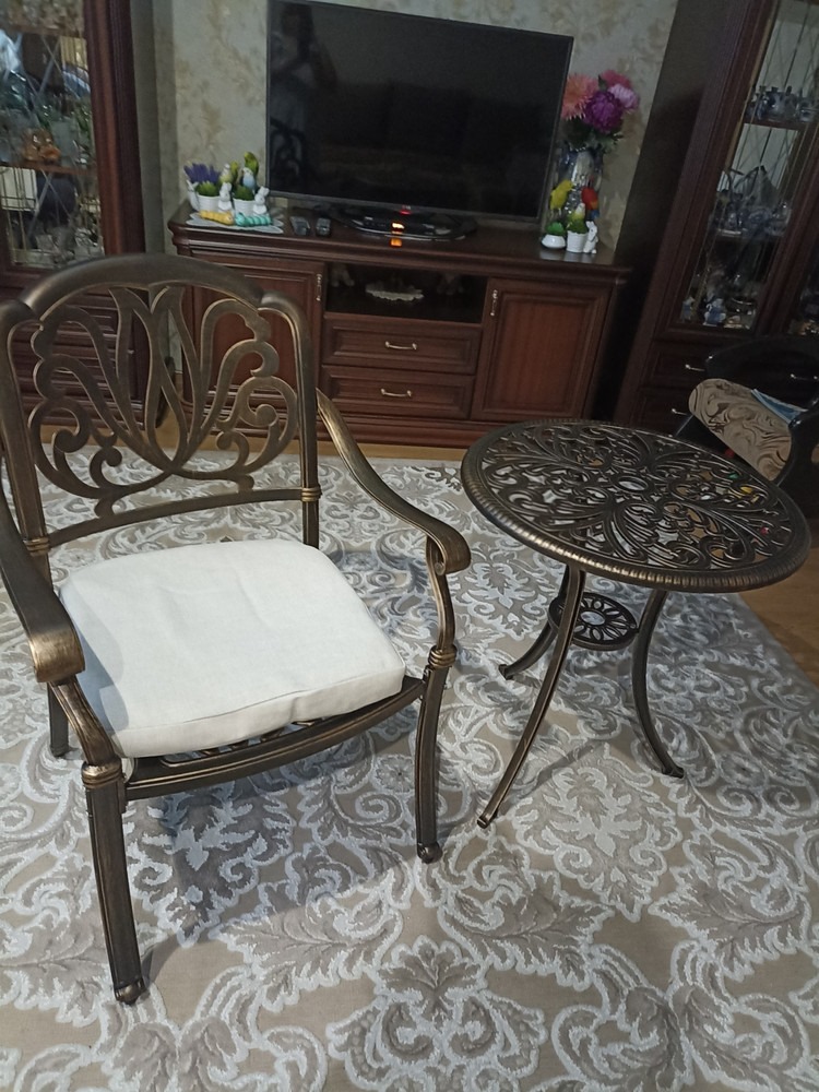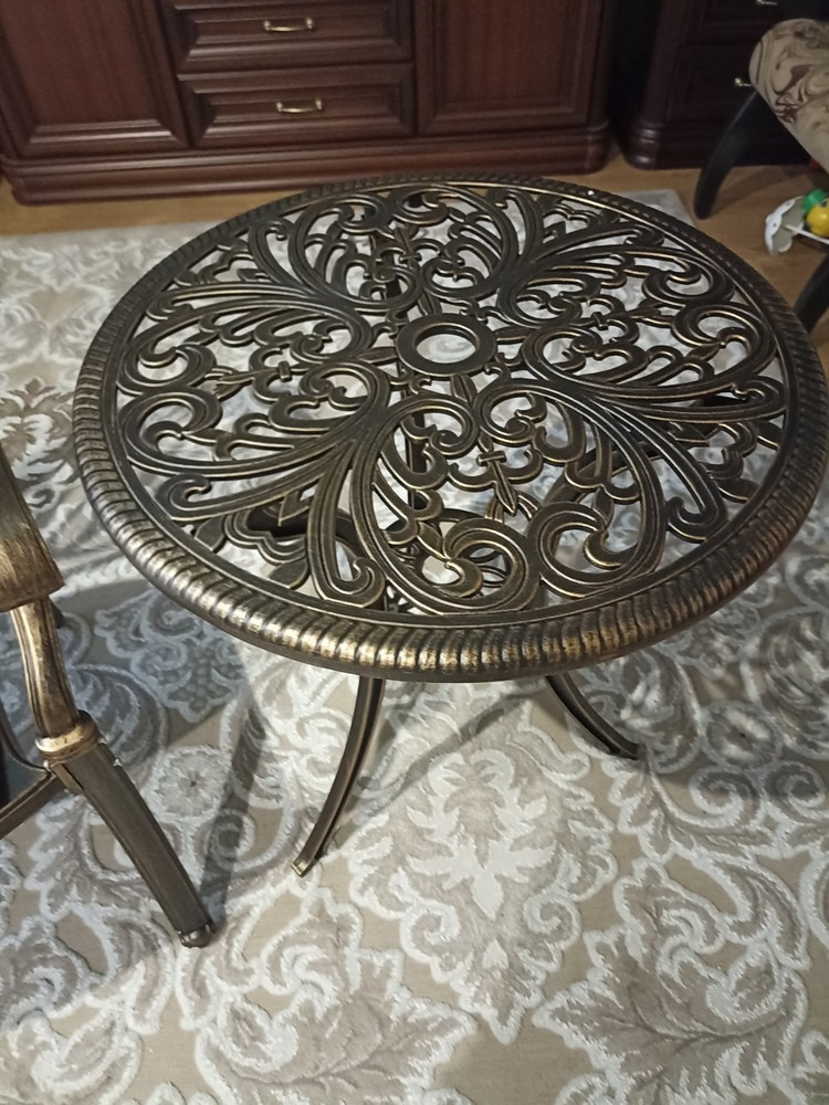Орнамент столешницы – это ручная работа и внимание к каждой детали. Литой алюминий в цвете античной бронзы выглядит роскошно и благородно, при этом материал абсолютно не требует сложного ухода. Он устойчив к влаге, коррозии и выгоранию, не боится перепадов температур.