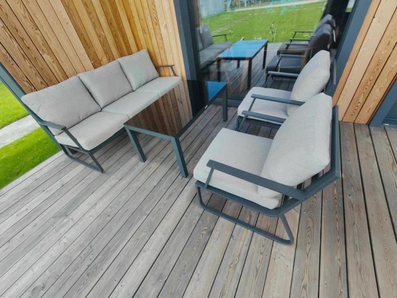 На фото клиента запечатлен комплект Royal Family FELIX, создающий идеальное пространство для отдыха. Алюминиевый каркас антрацитового цвета эффектно контрастирует со светлыми подушками из износостойкого Olefin, а стеклянная столешница журнального стола добавляет композиции легкости.