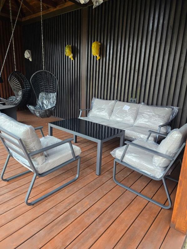 Лаконичный дизайн в цвете антрацит со светло-серыми подушками подчёркивает современную эстетику пространства. Прочный алюминиевый каркас с порошковой окраской гарантирует лёгкость и долговечность, а журнальный стол со столешницей из закалённого стекла добавляет воздушности композиции.