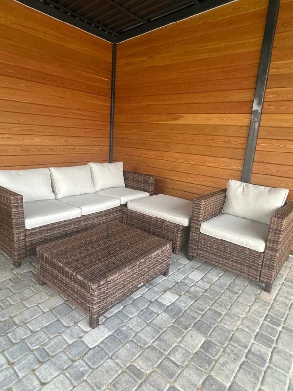 Аккуратная терраса с деревянной отделкой и плиточным полом обрела свой идеальный центр отдыха. Здесь органично разместился коричневый комплект GRAND VICKY, который благодаря сдержанному дизайну легко вписался в современное пространство.