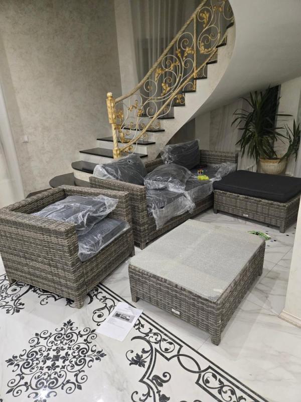 Изящная лестница с золотыми перилами, мраморный пол с орнаментом и ожидание первого чаепития. Комплект GRAND VICKY в сером цвете ещё в защитной плёнке, но уже видно, как гармонично он дополняет роскошный интерьер.