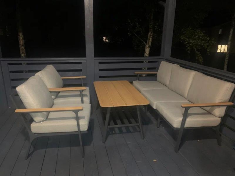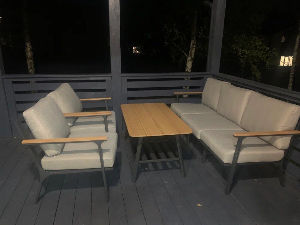 Вечернее освещение мягко подчеркивает изящные линии лаунж-зоны Royal Family OLIVER на серой террасе. Светлые подушки из материала Olefin создают уютный контраст с темным алюминиевым каркасом, а натуральный тик в деталях добавляет теплоту и естественность.