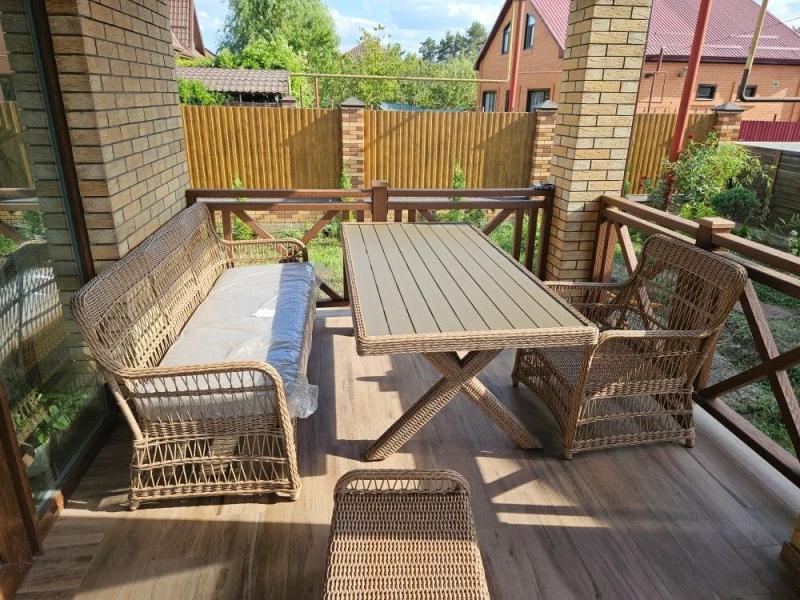 На загородной террасе комплект Royal Family ALBERT в тёплом соломенном цвете создаёт атмосферу расслабленного гостеприимства. Трёхместный диван, кресла с закруглёнными спинками и функциональные пуфы образуют уютное пространство, где можно собраться как для семейного обеда, так и для дружеской встречи.