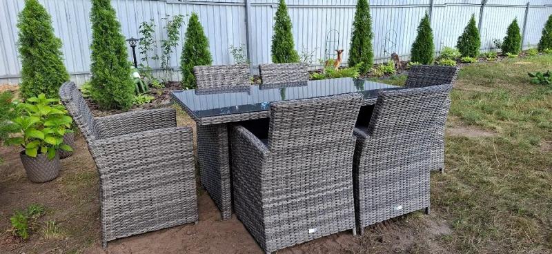 На фотографиях клиентов представлен обеденный комплект Royal Family FIONA в сером исполнении, ставший украшением двора загородного дома. Его сдержанная цветовая гамма и современный дизайн создают элегантную обстановку для семейных обедов и дружеских встреч на свежем воздухе.