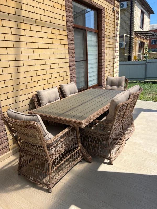 На открытой террасе во дворе частного дома комплект Royal Family ISABELLA в соломенном цвете создаёт атмосферу естественного уюта. Шесть удобных кресел с ортопедическими спинками и прямоугольный стол со смещёнными крестовинами ножек образуют продуманное пространство, где каждый гость чувствует себя комфортно.