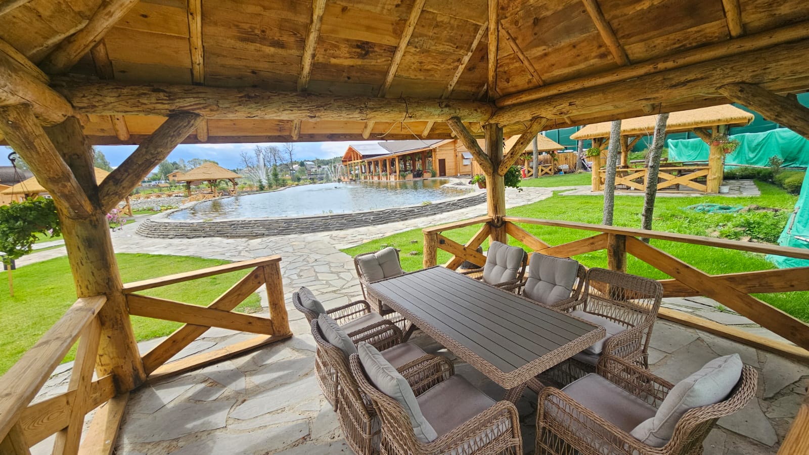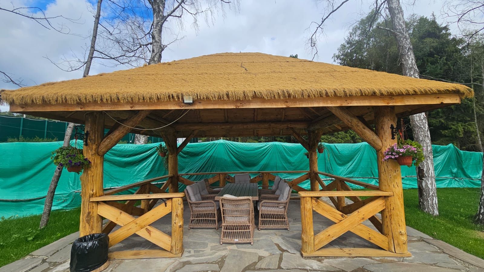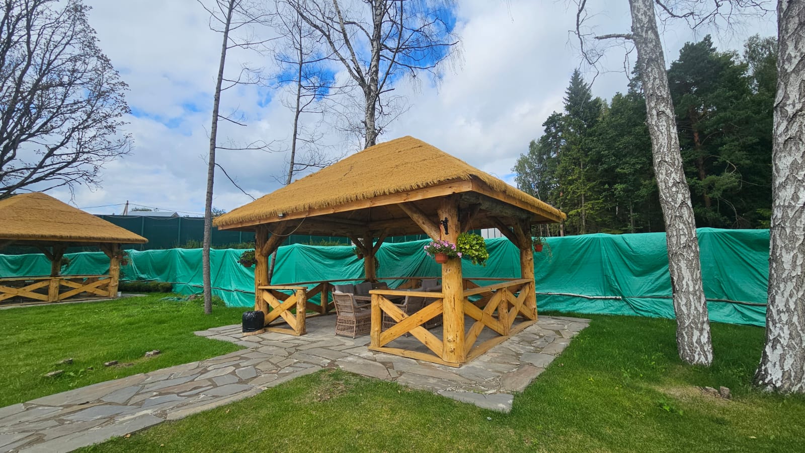 На фотографиях из деревни Сераксеево Серпуховского района — восемь комплектов Royal Family ISABELLA, установленных в беседках из массивного дерева. Соломенный оттенок плетеной мебели и натуральная текстура древесины создают единое пространство, где чувствуется связь с природой.
