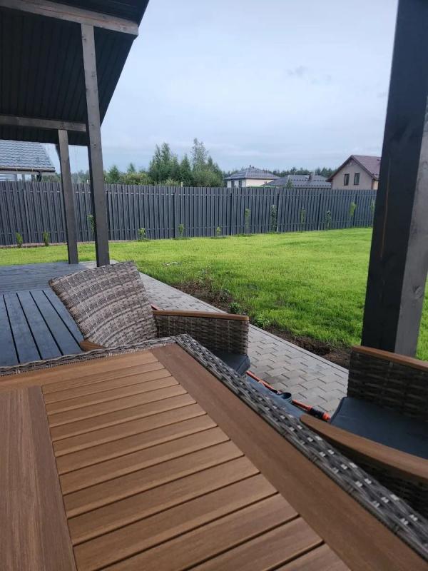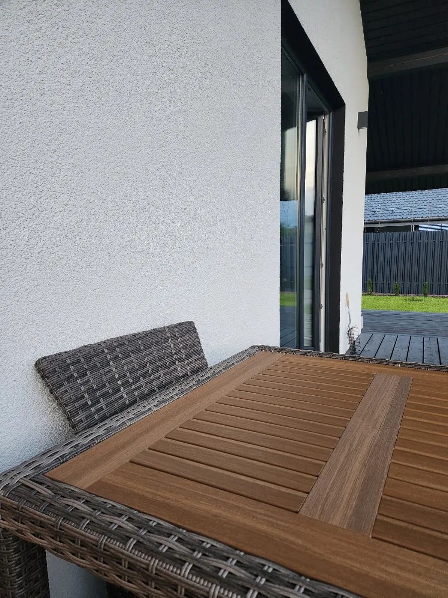 На фотографиях — выразительные фрагменты обеденного комплекта Royal Family AMELIA, запечатлённые на террасе загородного дома. Крупным планом видно, как искусственный ротанг с его аутентичным плетением сочетается с матовой поверхностью столешницы из поливуда, создающей иллюзию натурального дерева.
