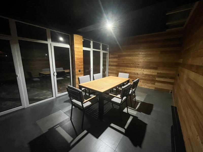 Закрытая веранда с деревянными стенами и панорамным остеклением – идеальное место для уединённых ужинов при мягком свете ламп. Здесь органично разместился обеденный комплект Royal Family OSCAR со столешницей из натурального тика.