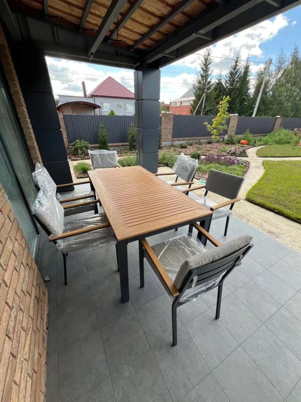 На открытой террасе загородного дома обеденный комплект OSCAR создаёт атмосферу естественного уюта. Алюминиевый каркас обеспечивает лёгкость и долговечность, а стол и подлокотники из массива тика привносят в пространство природную теплоту и благородную текстуру.