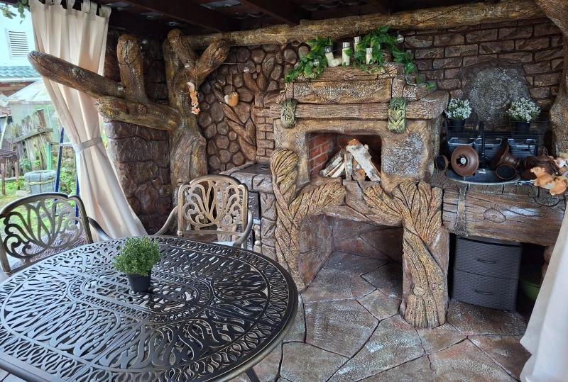 Уютная крытая зона с декором из натурального камня и дерева – идеальное место для кулинарных вечеров! Здесь органично разместился обеденный комплект Royal Family WILHELM из литого алюминия в бронзовом цвете.
