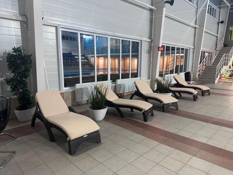 Светлый кафель, панорамные окна и шум воды – идеальный фон для перезагрузки. В этом пространстве шезлонги Royal Family MARK в насыщенном коричневом оттенке создают визуальный ритм и уют, мягко контрастируя с прохладными тонами интерьера.