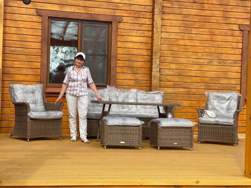 На фотографиях представлен обеденный комплект Royal Family VICTOR на деревянной террасе в городе Городец. Уютный диван, два кресла и практичный стол образуют гармоничное пространство, где можно собраться с близкими в любое время дня. Плетение из искусственного ротанга и мягкие подушки сочетают комфорт с устойчивостью к погодным условиям.