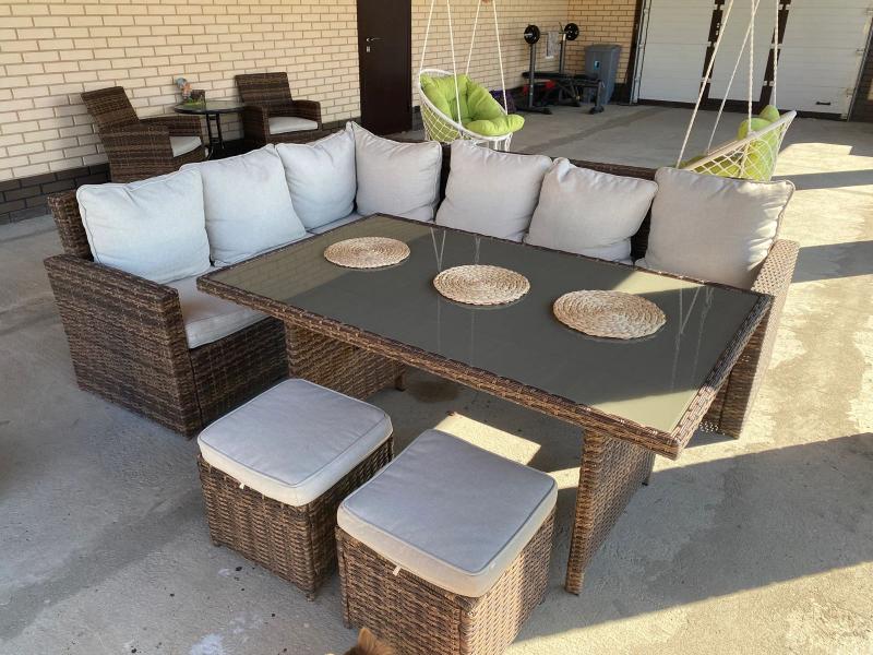 Во дворе загородного дома комплект Royal Family ZORRO PLUS DOUBLE в тёплом коричневом оттенке создаёт многофункциональную зону отдыха. Угловой диван, два пуфа и обеденный стол со стеклянной столешницей образуют пространство, где могут разместиться до семи человек — для тихого семейного ужина или весёлой встречи с друзьями.