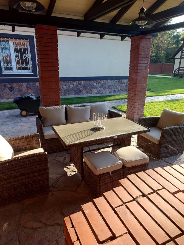 В беседке во дворе загородного дома комплект Royal Family ZOYA в тёплом коричневом цвете создаёт уединённый уголок для отдыха. Большой диван, два кресла с наклонными спинками и практичные пуфы образуют многофункциональную зону, где можно укрыться от солнца или провести вечер за чашкой чая.