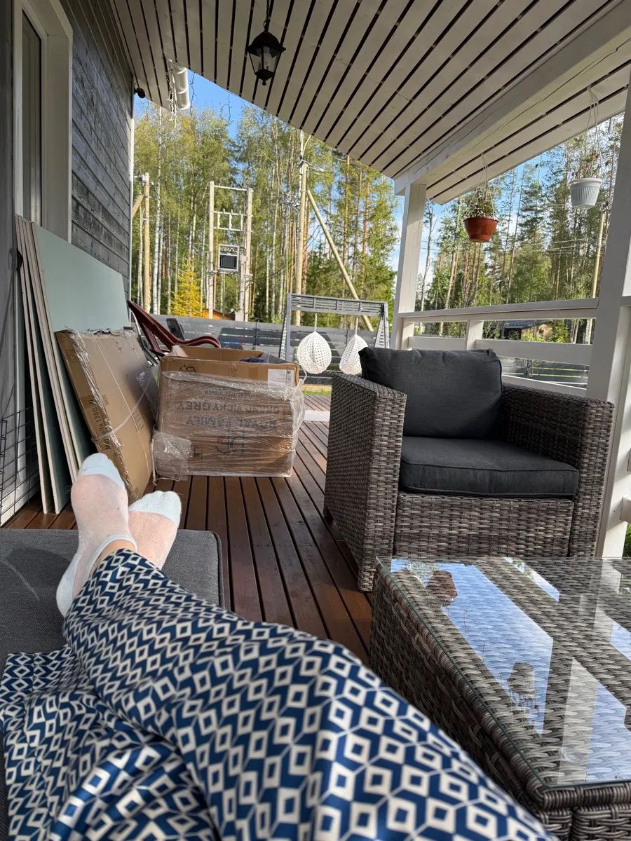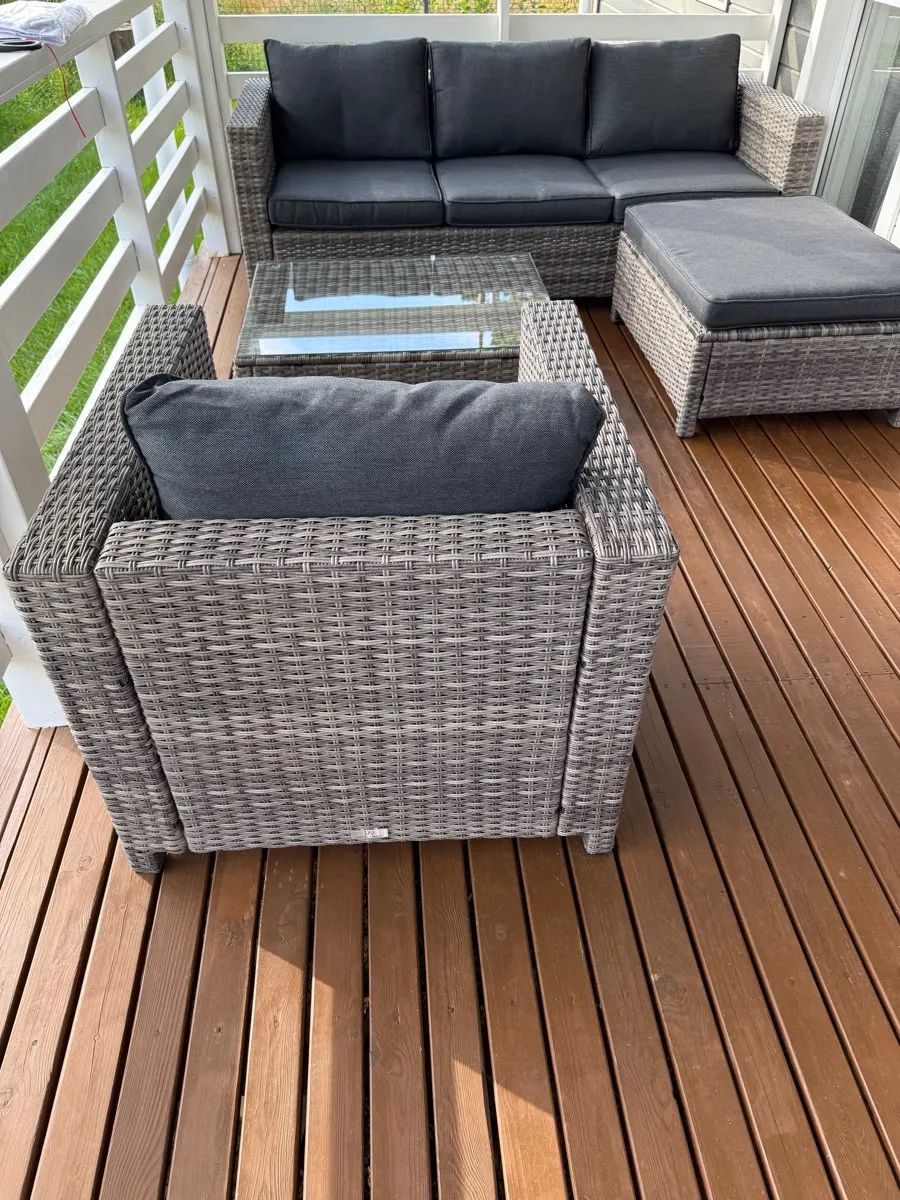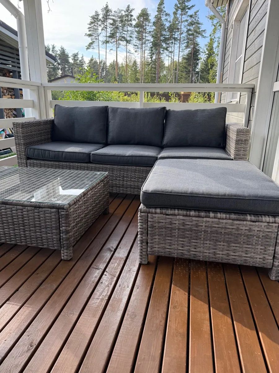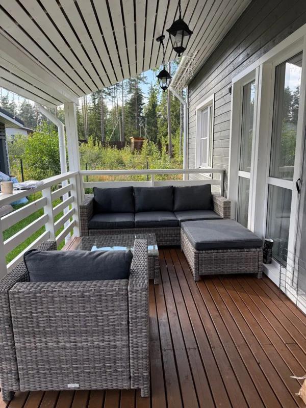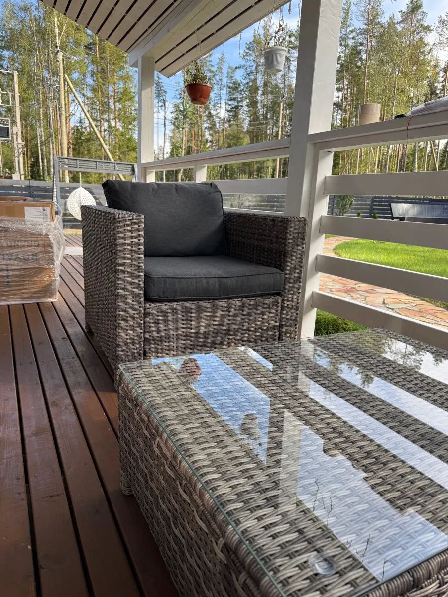 На дачной террасе комплект GRAND VICKY в сером цвете создает многофункциональную зону отдыха. Угловой диван, кресло и пуф с мягкими подушками образуют комфортабельную область для чтения, бесед или чаепитий, а стеклянный столик служит элегантным и практичным дополнением.