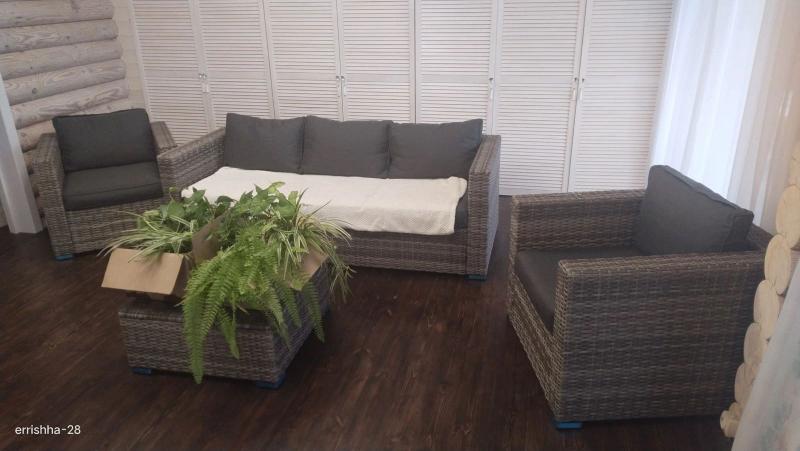 Трёхместный диван с графитовыми подушками, два кресла с массивными подлокотниками и журнальный столик создали полноценную лаунж-зону. Искусственный ротанг ручного плетения выглядит благородно как на открытом воздухе, так и в закрытом пространстве.