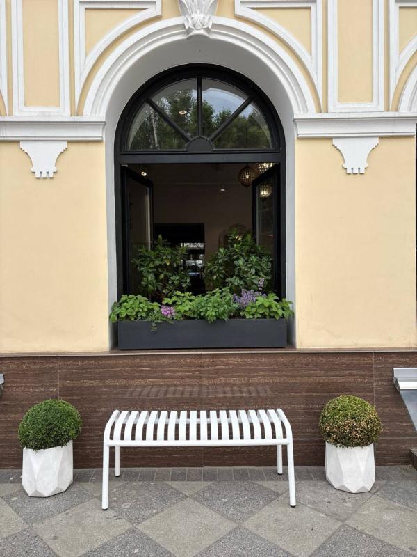 На фото — скамья Flow в белоснежном исполнении, ставшая лаконичным акцентом ландшафта.