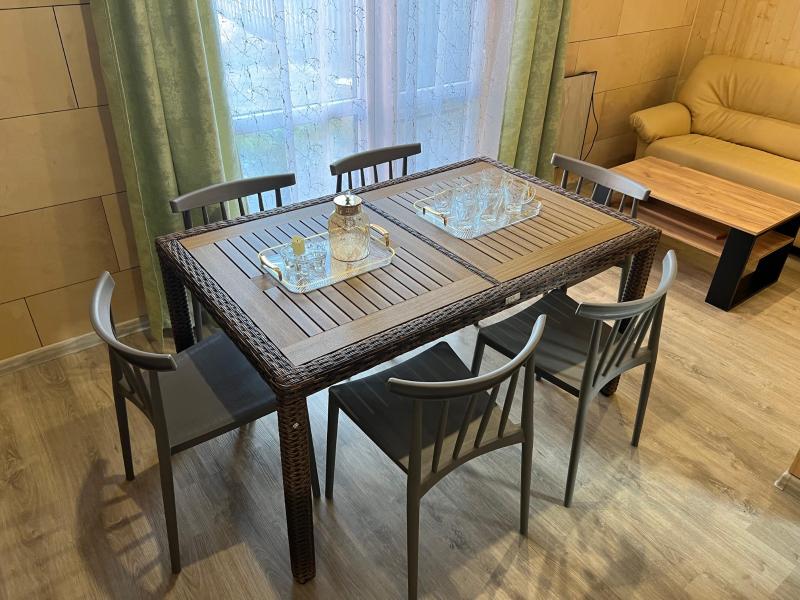 На фотографии — обеденная группа, сочетающая стол AMELIA 150 в благородном коричневом цвете и шесть стульев KAI в нежном оттенке капучино. Этот дуэт создает в интерьере атмосферу уютной элегантности, где каждая деталь продумана до мелочей.