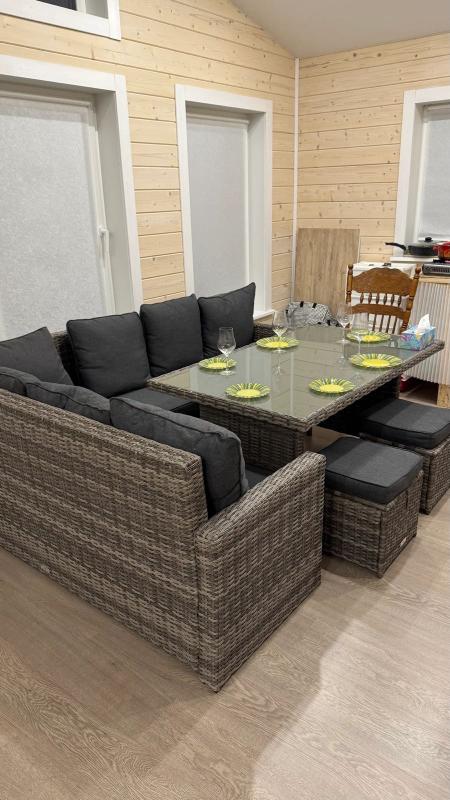 Светлое дерево стен и пола создаёт тёплый фон для монохромного серого комплекта ZORRO. На фото видно, как садовая мебель преображает пространство внутри дома, становясь центром притяжения для уютных ужинов.