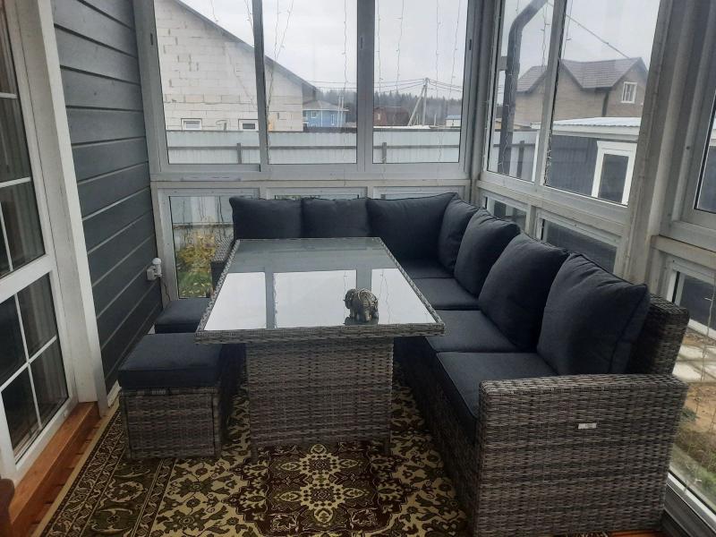 Серый техноротанг ручного плетения в сочетании со стеклянным столом создают ощущение лёгкости, несмотря на внушительные размеры. Угловой диван вместит 5-6 человек, а два пуфа можно использовать как дополнительные места или убрать под стол для экономии пространства – настоящее спасение для уютных посиделок!