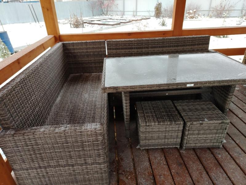На фотографиях – забота в действии. Комплект ZORRO в благородном сером оттенке занял своё место в деревянной беседке, а надёжный чёрный чехол уже ждёт своего часа, чтобы защитить мебель от снега, дождя и пыли в периоды простоя.