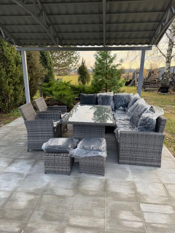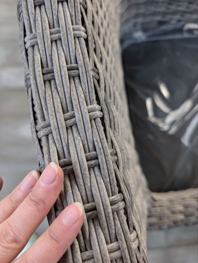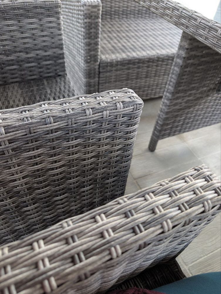 Серый техноротанг ручного плетения выглядит благородно и не требует сложного ухода, гармонично вписываясь в ландшафт. Стальной каркас гарантирует устойчивость, а водоотталкивающие чехлы на подушках защищают от капризов погоды.