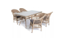 Обеденная группа «Амароне» относится к числу садовой мебели для обустройства открытых террас и веранд. В комплект входят: - обеденный стол «Латте» – 1600×900×750 мм - четыре стула «Сицилия», размер каждого – 590×640×820 мм. Алюминий используется при создании прочного каркаса мебели. Оформлен ручным плетением из круглого искусственного ротанга соломенного цвета. На креслах расположились мягкие подушки серого оттенка. Их чехлы изготовлены из полиэстера, плотность которого 230гр/м2. Ткань проходит обработку влагоотталкивающими составами. В качестве рабочей поверхности плетеного обеденного стола выступает стеклянная столешница, которая крепится при помощи вакуумных силиконовых держателей и поставляется в собранном виде.