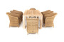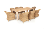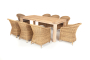 Стол изготовлен из тикового дерева. Все стулья с подлокотниками и подушками, алюминиевый каркас, круглый искусственный ротанг соломенного цвета. "Равенна" плетеное кресло из искусственного ротанга, цвет соломенный с серой подушкой 8шт. 570Х680Х810, "Витория" деревянный стол из натурального тика, 200х100см 1шт. 2 000Х1 000Х770,