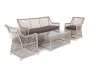 Оплетка выполнена вручную искусственным ротангом бежевого цвета, диван и кресло укомплектованы подушками из 100% полиэстера, которые пропитаны специальным составом, обладающим влагоотталкивающим свойством. "Латте" диван двухместный из искусственного ротанга, цвет бежевый 1шт. 1 600Х660Х850, "Латте" плетеное кресло из искусственного ротанга, цвет бежевый 2шт. 550Х660Х850, "Гранд Латте" стол журнальный из искусственного ротанга, цвет бежевый 1шт. 1 120Х570Х450,