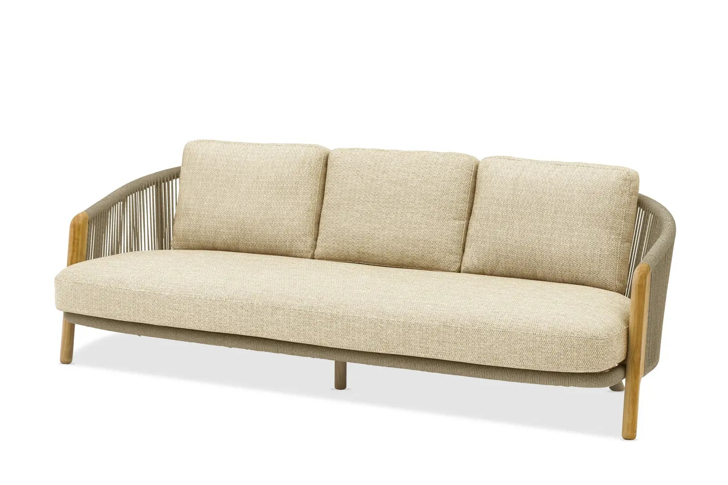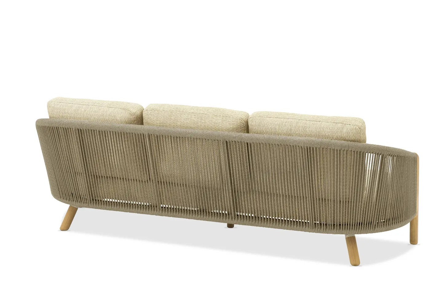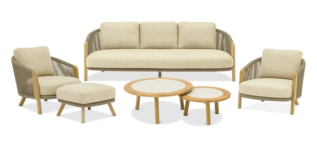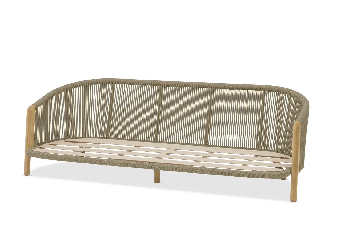 Алюминиевый каркас, ножки из тикового дерева FSC + олефиновая веревка, подушка с наполнителем из пенополиуретана, солнцезащитная ткань.