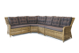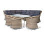 Угловая модульная лаунж зона с обеденным столом и тремя стульями. Искусственный ротанг, плетение круглое, цвет соломенный, алюминиевый каркас. Столешница из закаленого стекла.