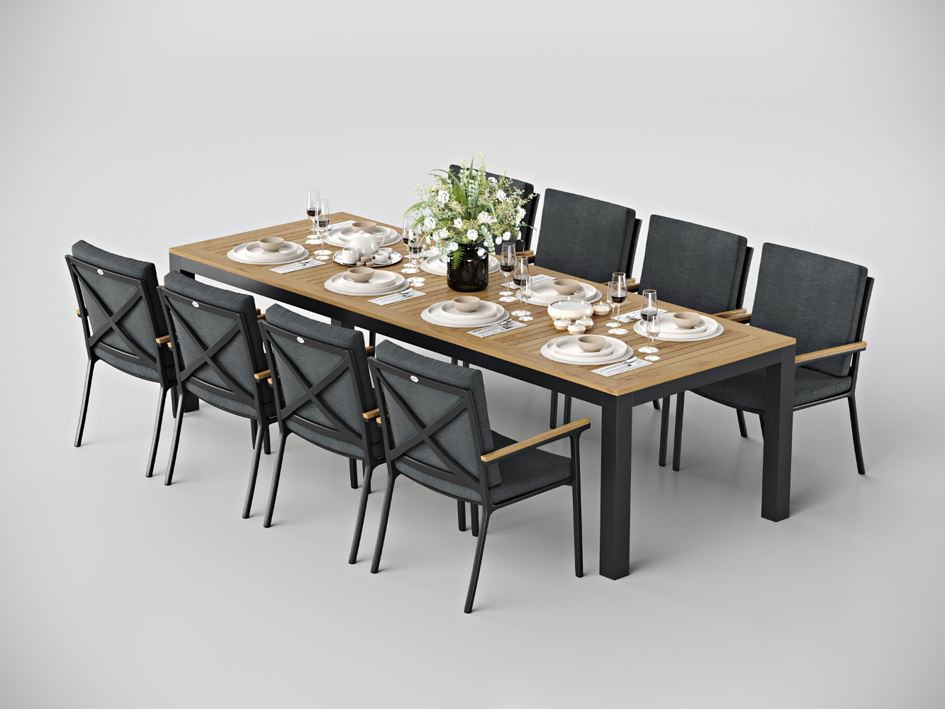 Каркас мебели выполнен из всесезонного алюминия с порошковым покрытием темно - серого цвета (карбон), подлокотники стульев декорированы вставками из тика, подушки сидений и спинки обшиты уличной тканью (олефин) темно - серого цвета, толщина подушек 5 см, чехол съёмный на "молнии", столешница обеденного стола изготовлена из тиковых планок.