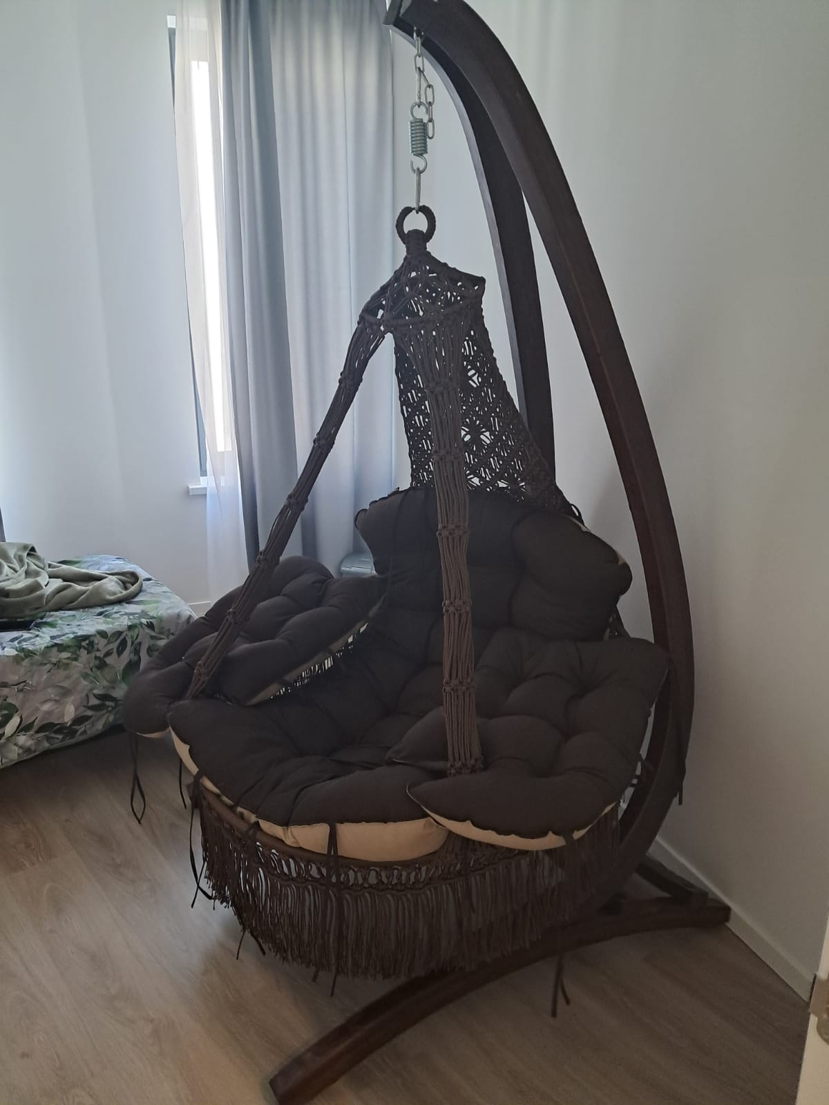 CARTAGENA подвесное кресло - это модная новинка с невероятно мягкими и комфортными подушками. Сплетено вручную из полиамидной нити. Кресло украшено эффектной бахромой и станет стильным акцентом в любом помещении и ландшафте. Подвесное кресло CARTAGENA из хлопко-полиэфирного материала не теряет формы. Наполнитель подушек – «холлофайбер» не отсыревает и быстро восстанавливает форму. Для удобства в кресле CARTAGENA предусмотрена регулировка по высоте передней части кресла. Таким образом, с этой помощью фиксаторов внутри декоративной оплетки, можно настроить наиболее комфортное положение кресла. Полиамидная нить, цвет коричневый/черный/бежево коричневый, подушки - чехол цвет бежево коричневый и зеленый (цена указана за кресло КАРТАГЕНА с подушками) + каркас для подвесных кресел CORSA (дерево)