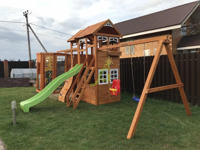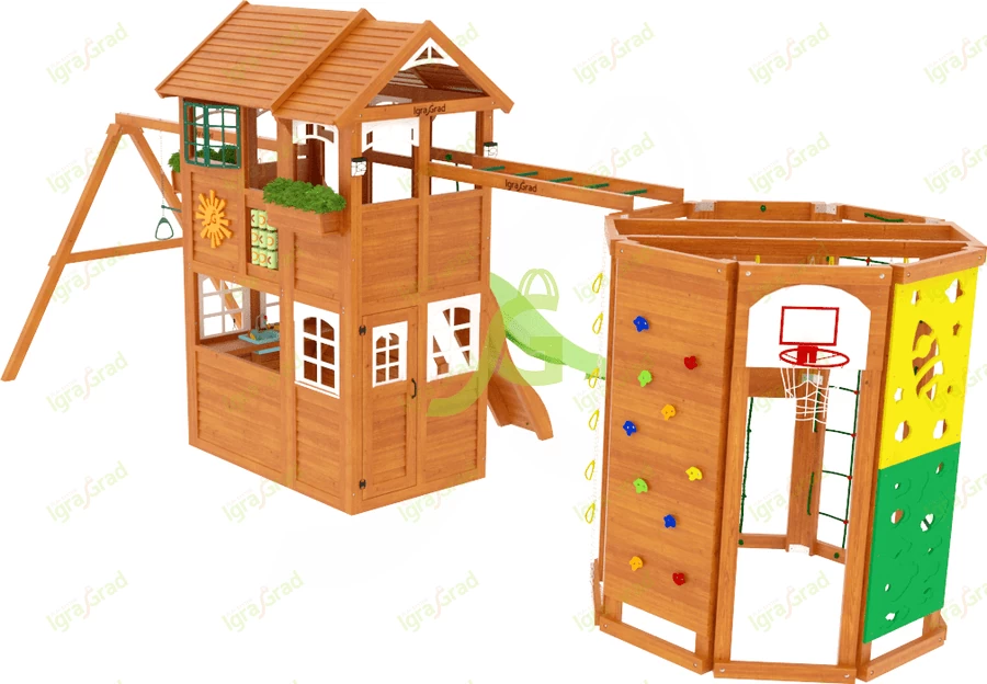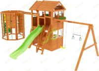 Детский игровой комплекс представлен в виде двухуровнего игрового домика с дверью, окнами. Его дополнительными элементами являются многогранная шведская стенка, качельный модуль.
