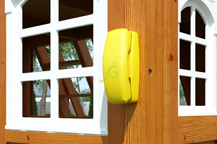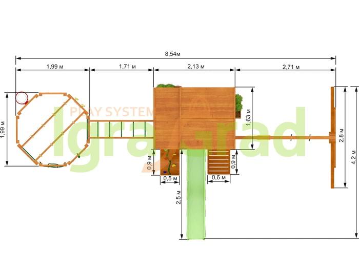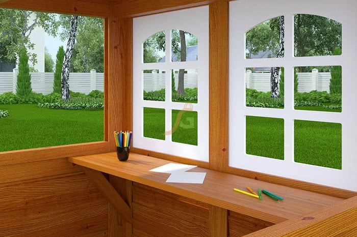 - закрытый двухуровневый игровой домик с дверью, деревянной крышей;
