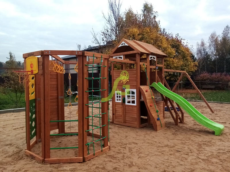 - Древесина имеет низкую теплопроводимость, поэтому в любое время года детям будет приятно приводить время на такой площадке.