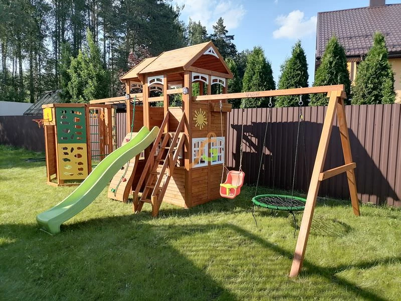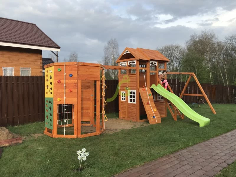 Сооружение оборудовано многочисленными спортивно-игровыми атрибутами: горкой, скалодромом, канатом, рукоходом, качелями, верёвочной лестницей и другими элементами для организации сюжетно-ролевой игры.