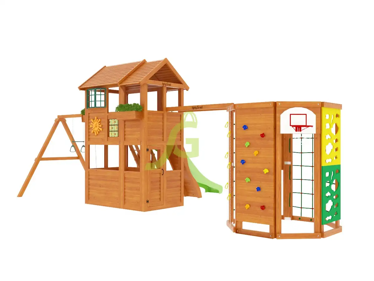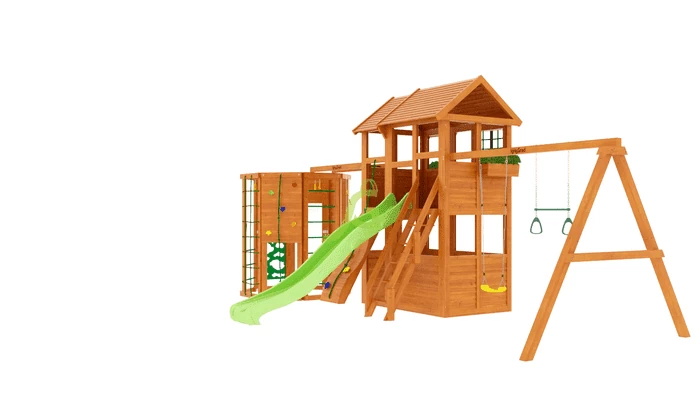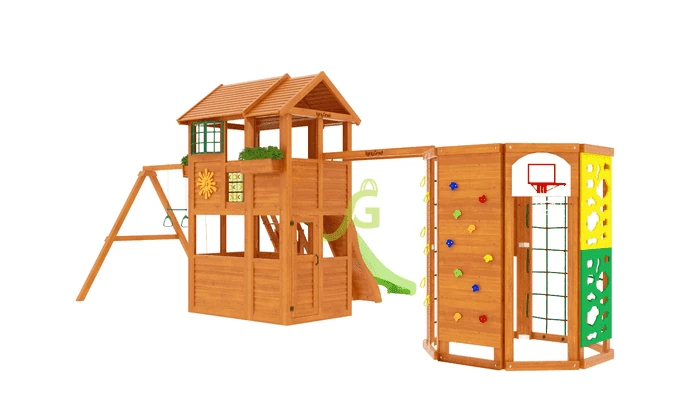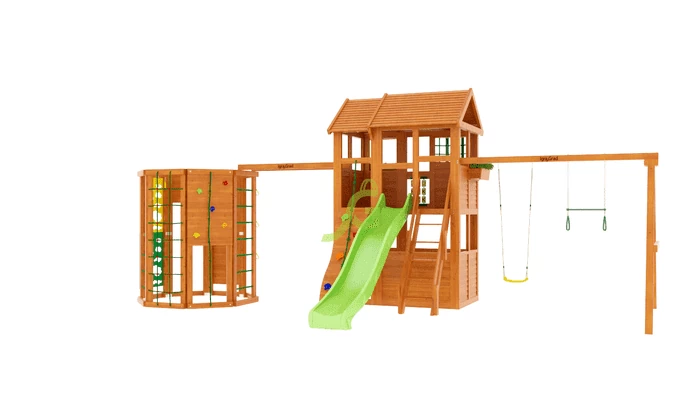Для шустрых, подвижных деток предусмотрено наличие трапеции с кольцами, верёвочная лестница, стена альпиниста, обезьянья тропа, скалодром с канатом для восхождения, качели, верёвочная лестница, горка. Благодаря играм со штатными элементами и навесным оборудованием ребёнок становится ловким и сильным. Ведь у него начинают полноценно развиваться мышцы, укрепляться суставы, связки, формируется правильная осанка.