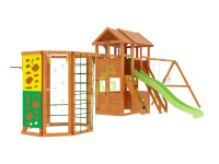 Модель представляет собой высокий двухэтажный домик с крышей. Основание конструкции можно оборудовать под песочницу, в этом случае высокие бортики и навес будут защищать малышей от ветра, солнца и даже дождя. Верхняя часть сооружения даёт возможность скатиться с горки, перебраться по рукоходу на шведскую стенку.