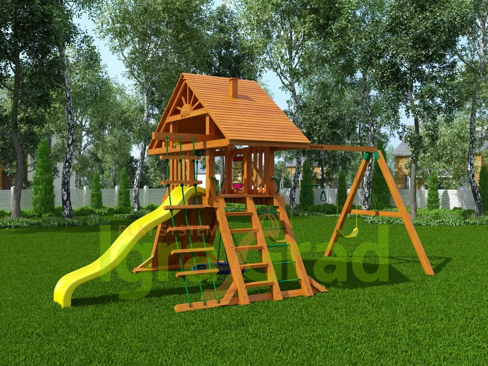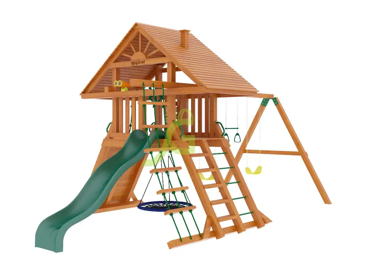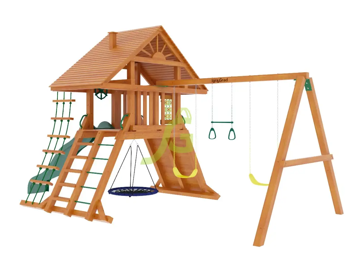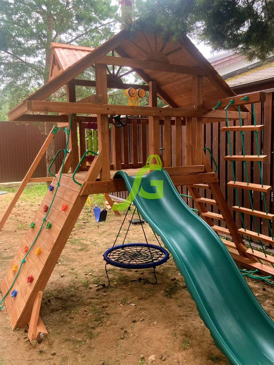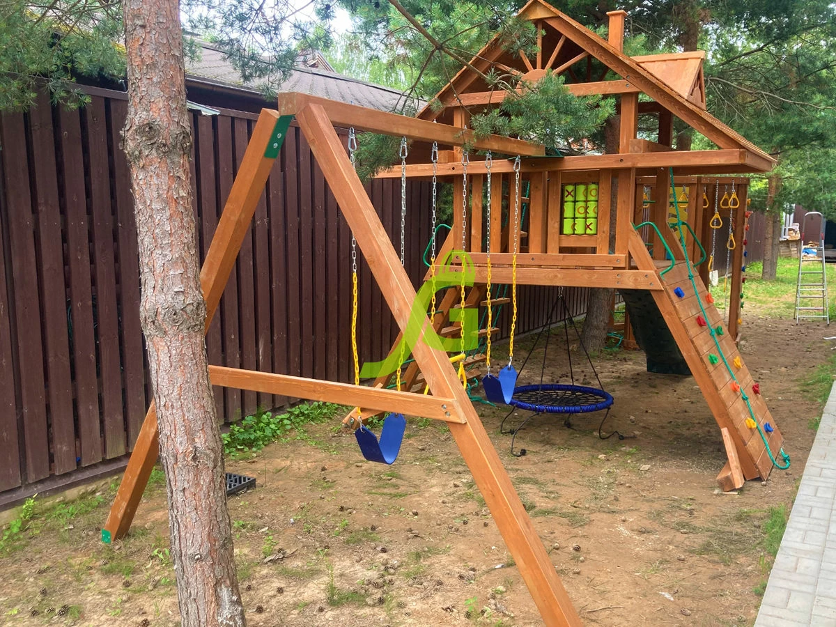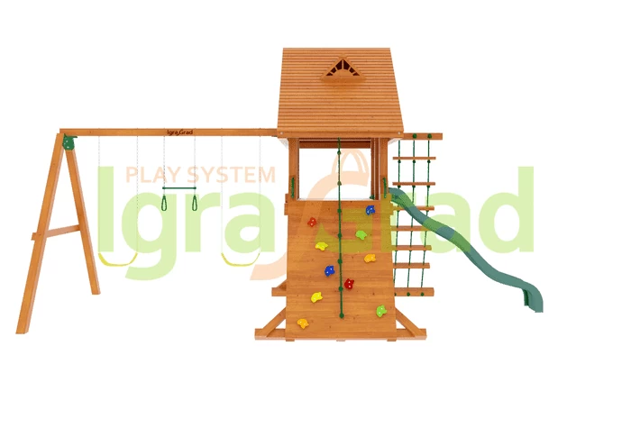 Наш магазин предлагает заботливым родителям обратить внимание на интереснейшую детскую площадку «Крепость Фани» (Дерево). Большой, двухуровневый домик оборудован полезными спортивными снарядами: скалолазной стеной, верёвочной лестницей, трапецией с кольцами, качелями «Овал», развивающие выносливость, дыхание, координацию, укрепляющие мышцы. Дети любят кататься с горки, качаться на качелях. Поэтому данные элементы тоже входят в комплект.