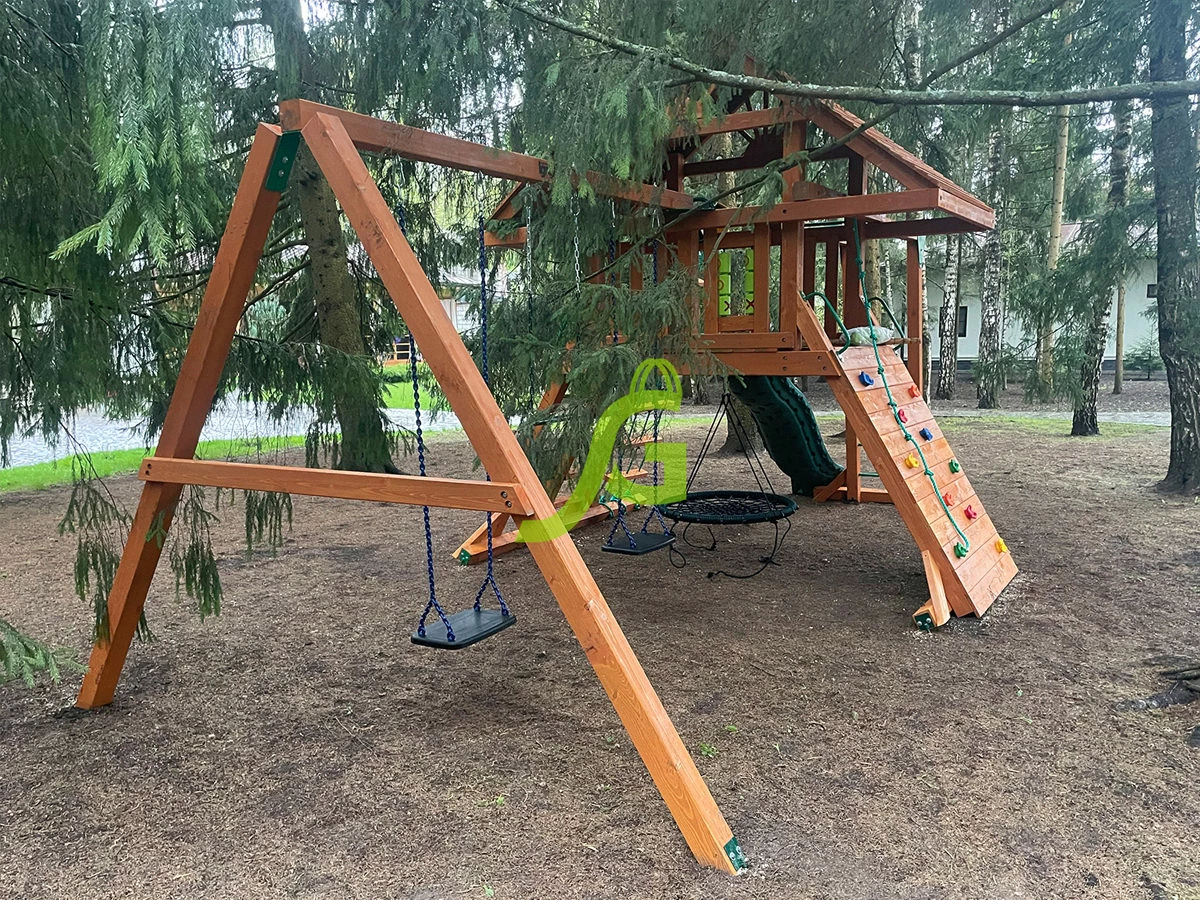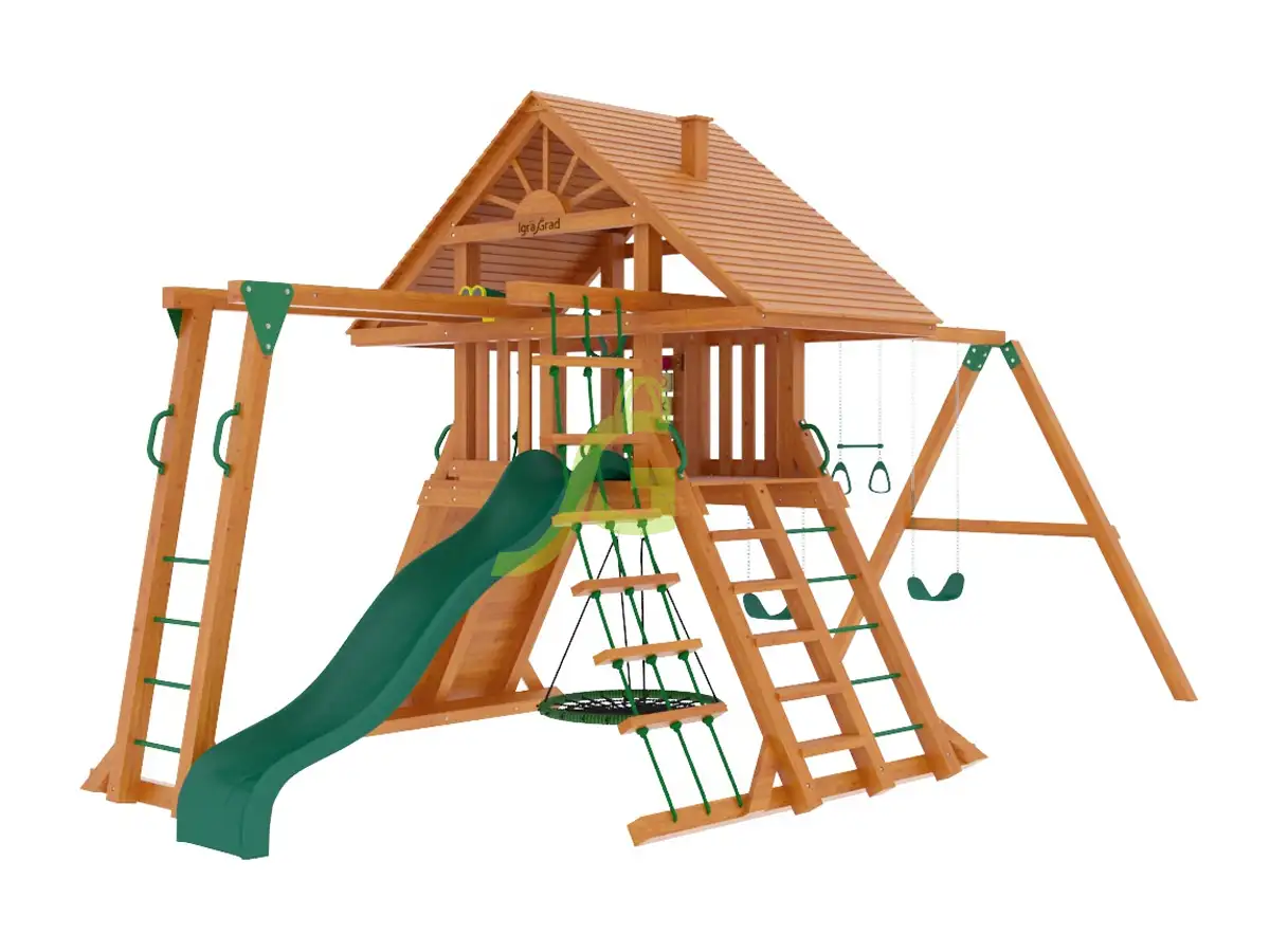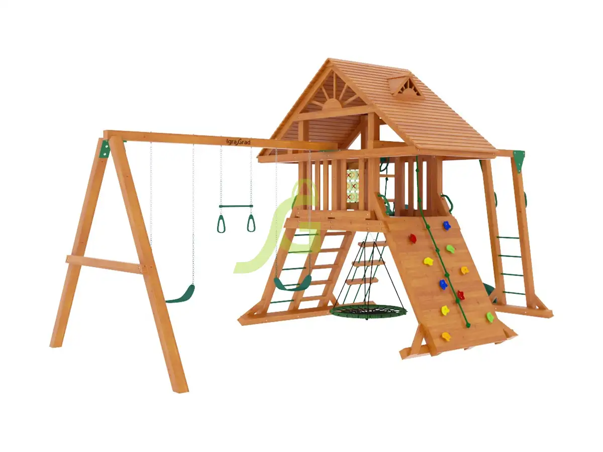 Детская площадка «Крепость Фани с рукоходом» (Дерево) - мечта всех детей. Уникальная конструкция впечатляет внешним видом и функциональными данными. Дети любого возраста могут найти для себя увлечение: покататься с горки, поиграть в полезную игру «Крестики-нолики», покачаться на качелях, порезвиться на качельке гнездо-паутинка.